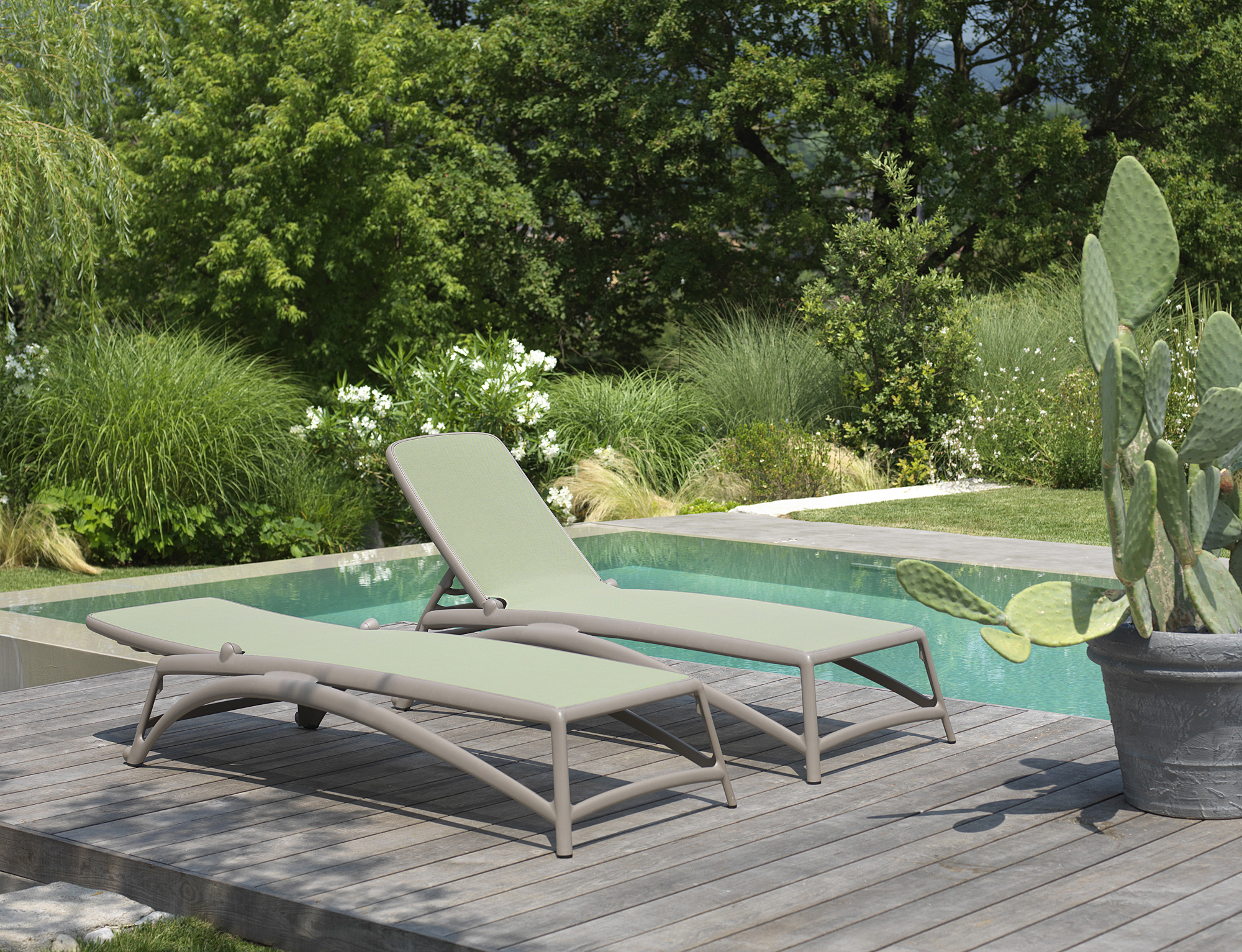 Lettino prendisole. Materiale: struttura tubolare in polipropilene fiberglass trattato anti-uv e colorato in massa. Interno in tessuto sintetico traspirante e ricambiabile. Resina riciclabile.