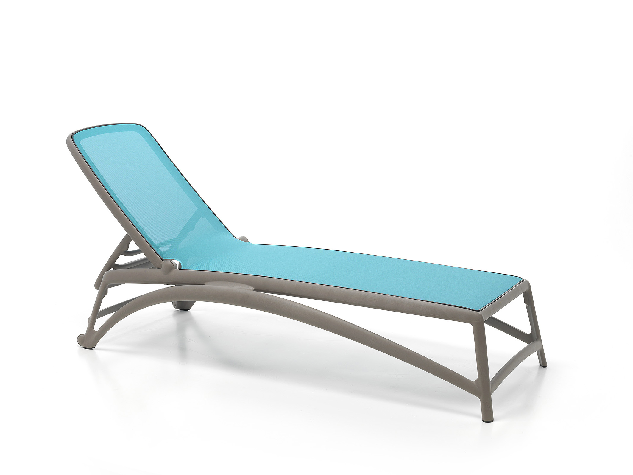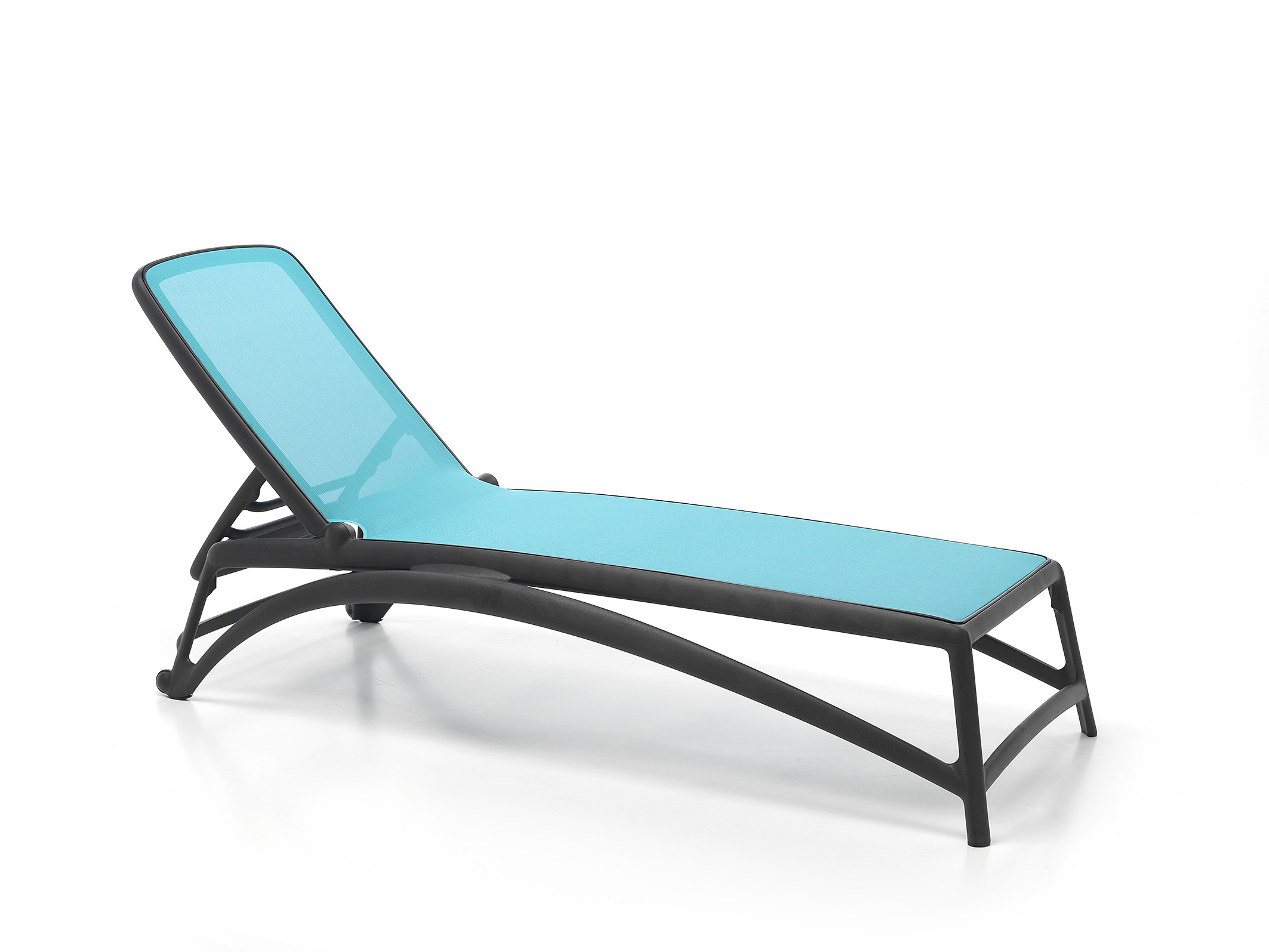 Forme ergonomiche che si adeguano in modo uniforme ed elastico allo scarico del peso e design filante per Atlantico, lettino prendisole con struttura in resina fiberglass e tessuto traspirante e ricambiabile. Schienale regolabile su quattro posizioni. Impilabile.