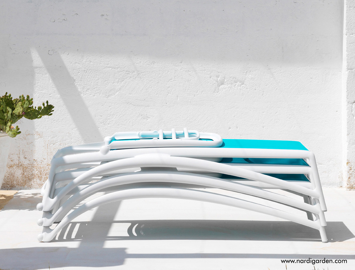 Lettino prendisole. Materiale: struttura tubolare in polipropilene fiberglass trattato anti-uv e colorato in massa. Interno in tessuto sintetico traspirante e ricambiabile. Resina riciclabile.
