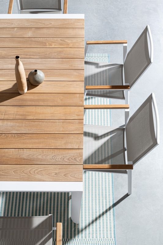 STRUTTURA IN ALLUMINIO, VERNICIATO A POLVERE (POLIESTERE). BRACCIOLI CON INSERTI IN TEAK. SEDUTA E SCHIENALE RIVESTITI IN TEXTILENE PHIFER 1X1. IMPILABILE.