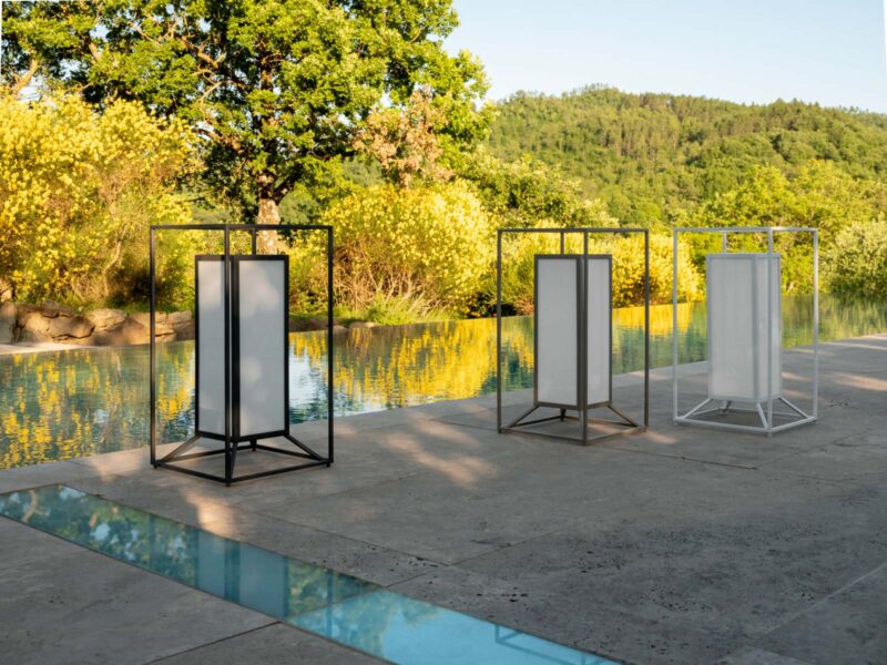 Le linee essenziali della lanterna tracciano un collegamento diretto con gli elementi voluminosi della collezione. La struttura della lampada è disponibile in 3 colori: tortora, bianco, grigio scuro.