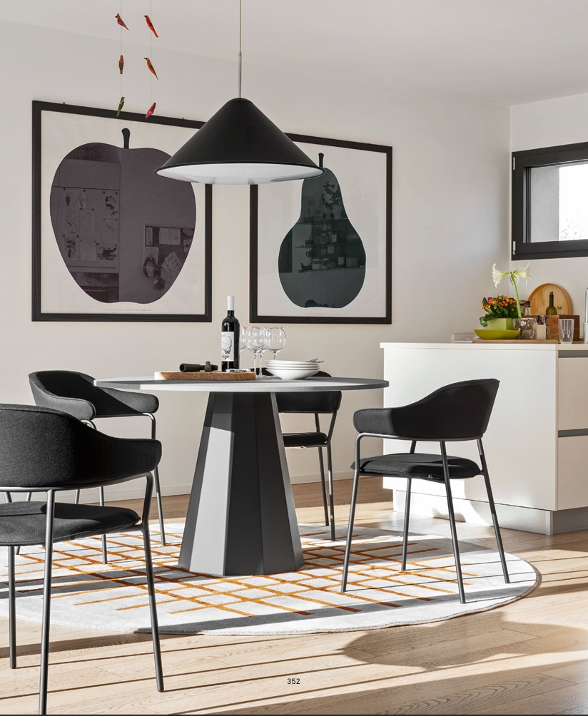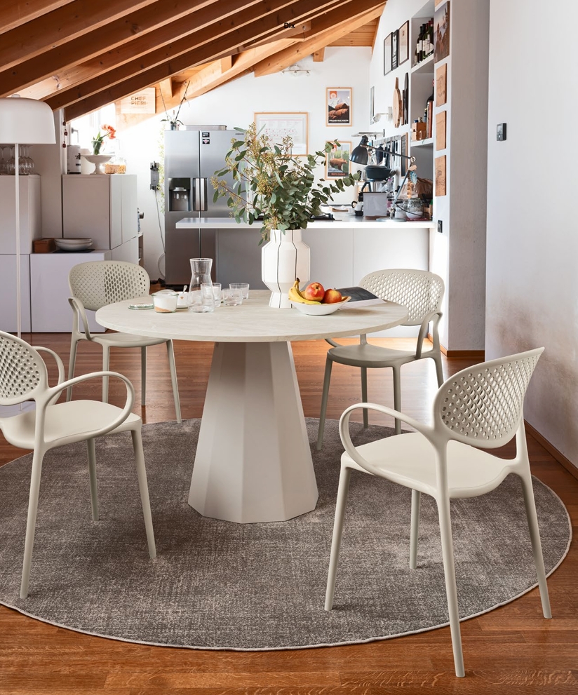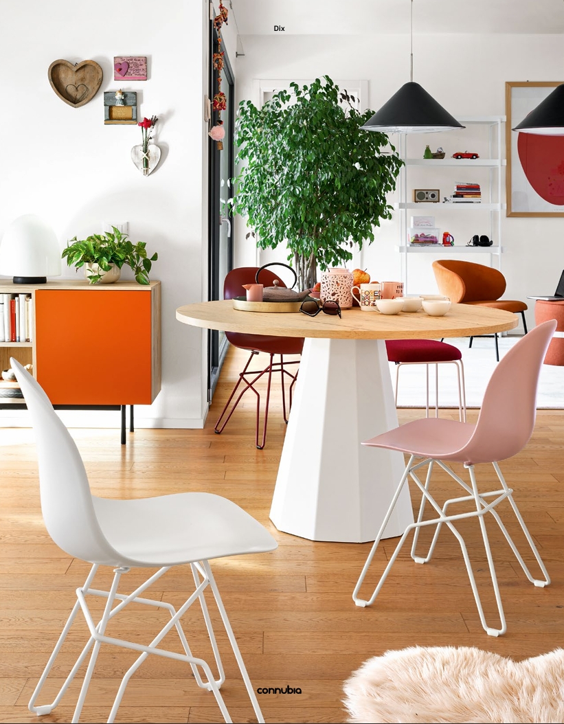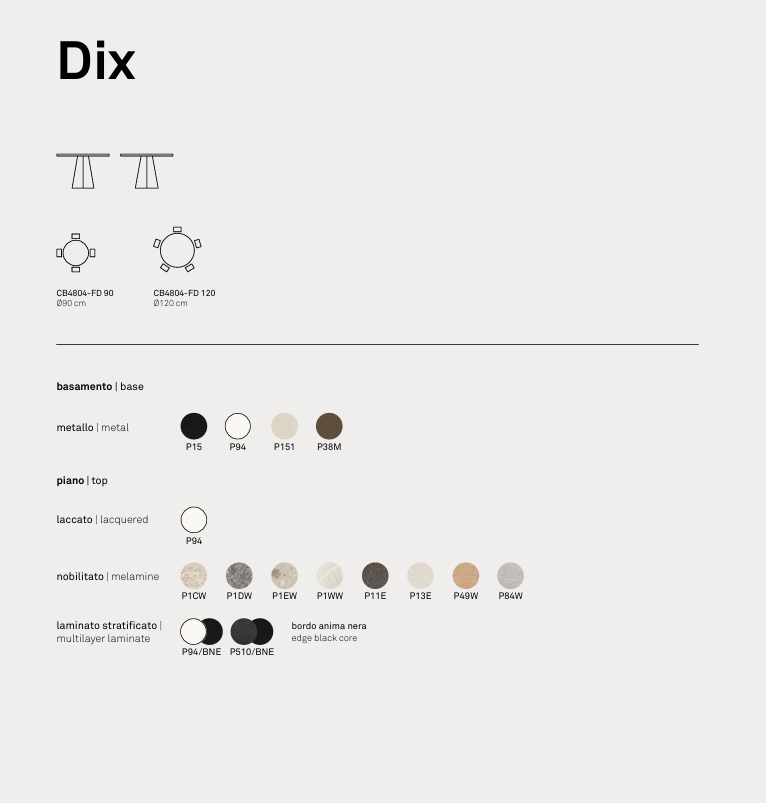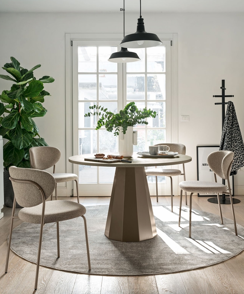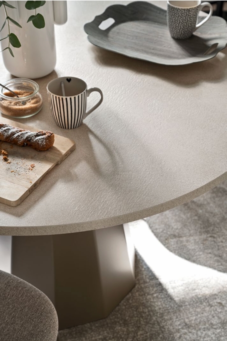 Tavolo fisso tondo DIX, con basamento in lamiera verniciata sfaccettata a base decagonale conica. Adatto a qualsiasi tipo di pavimento grazie al piedino regolabile nascosto all’interno