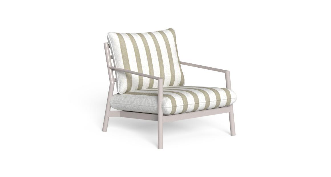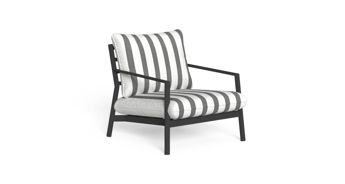 La poltrona Finn riprende lo stesso linguaggio formale della collezione: struttura in alluminio dalle linee nette, proporzioni contenute e comfort intuitivo.