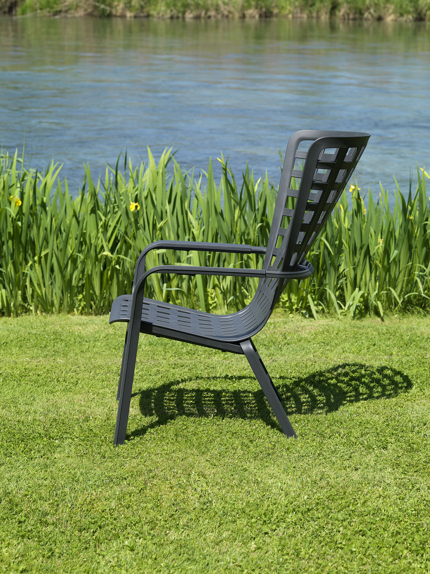 Poltrona reclinabile. Materiale: polipropilene fiberglass trattato anti-UV e colorato in massa. Finitura opaca. Dotata di piedini antiscivolo. Cuscino disponibile su ordinazione. Resina riciclabile.