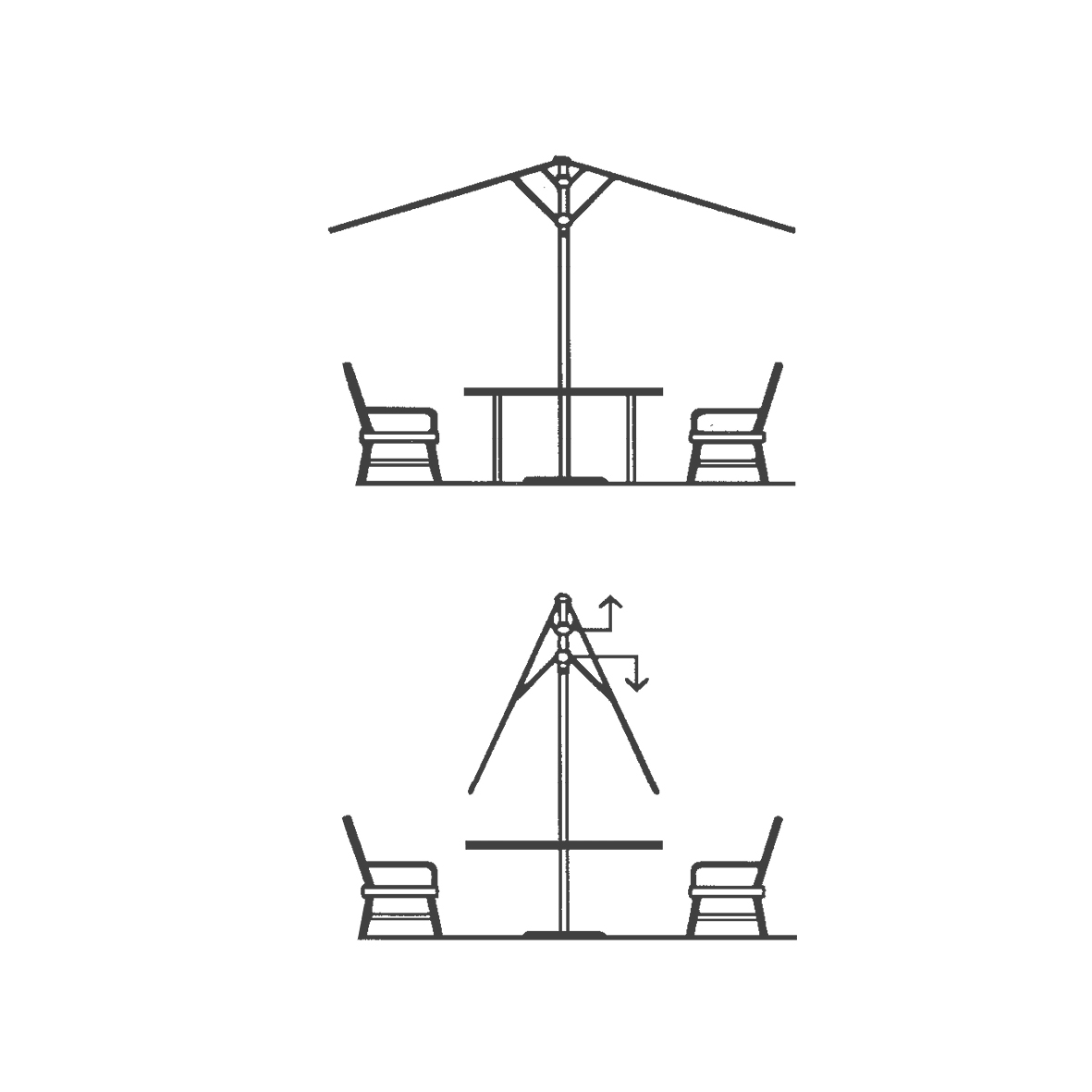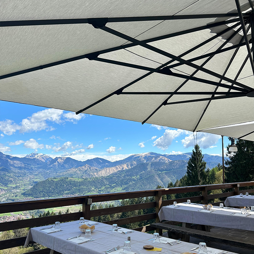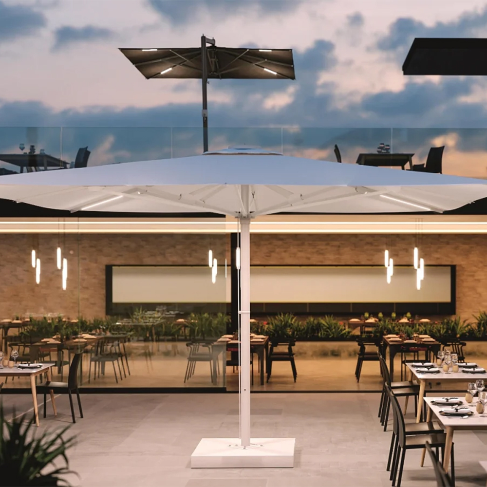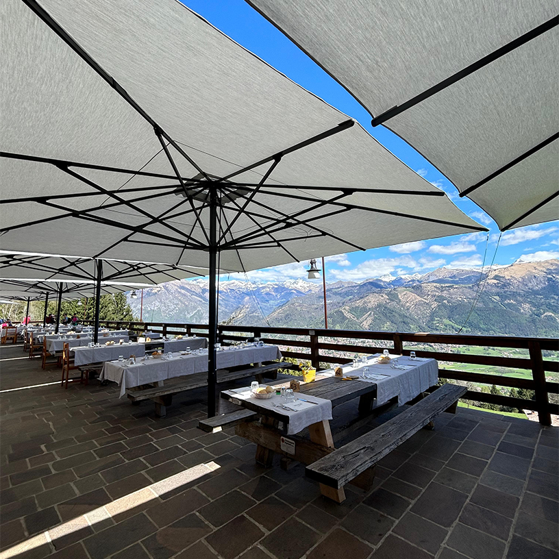 Sistema telescopico a doppio ragno che consente la chiusura sopra i tavoli sottostanti.