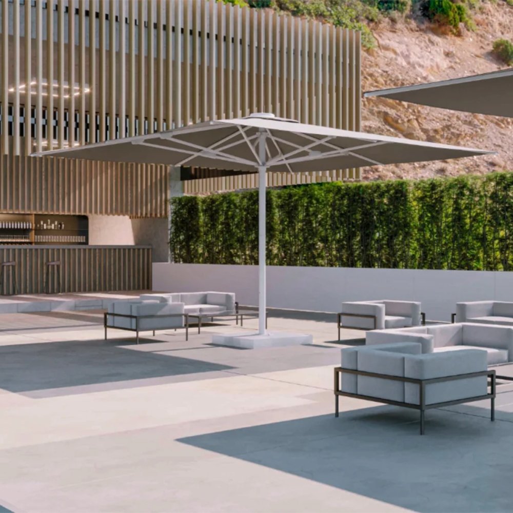 La struttura è in alluminio verniciato colore bianco oppure antracite mentre la copertura può essere scelta tra acrilico (colore ecrù), tempotest parà (molti colori disponibili) o pvc (colere bianco o beige). L’ombrellone presenta diversi optional tra cui: