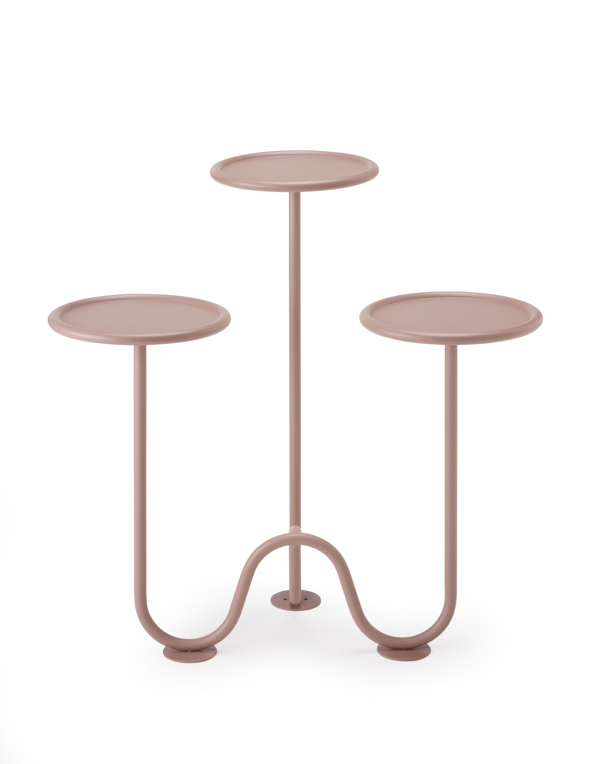 Come sospesi in levitazione, questi supporti arrotondati accolgono composizioni floreali o piante ornamentali, mentre il tubolare sinuoso che collega i vassoi evoca con una linea l’idea di radice o rizoma. Grafici e colorati, questi porta pianta possono essere inseriti in un angolo, contro un muro o come applique, infondendo morbidezza e senso di accoglienza ad ogni ambiente.