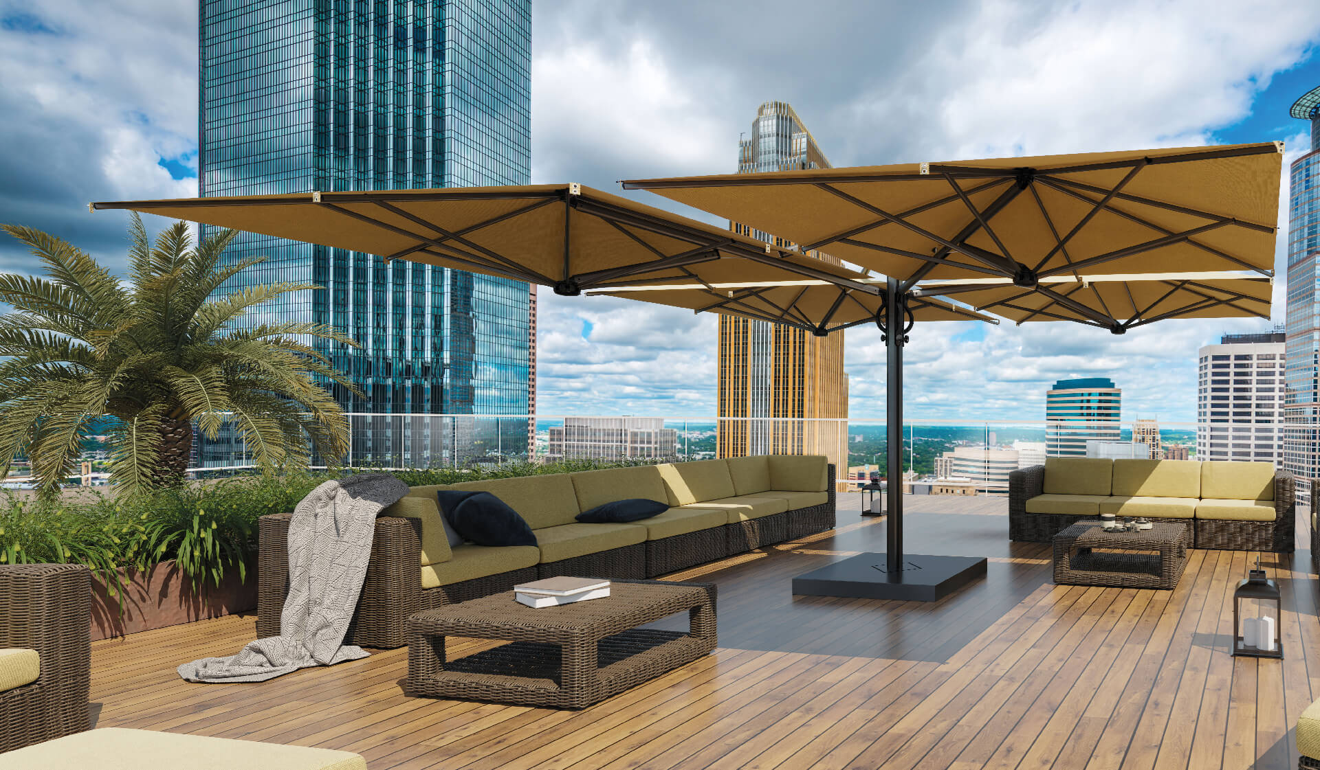 Telaio in alluminio con verniciato antracite, bianco, titano o effetto wood. Struttura robusta composta da 4 ombrelloni ancorati ad un unico sostegno.