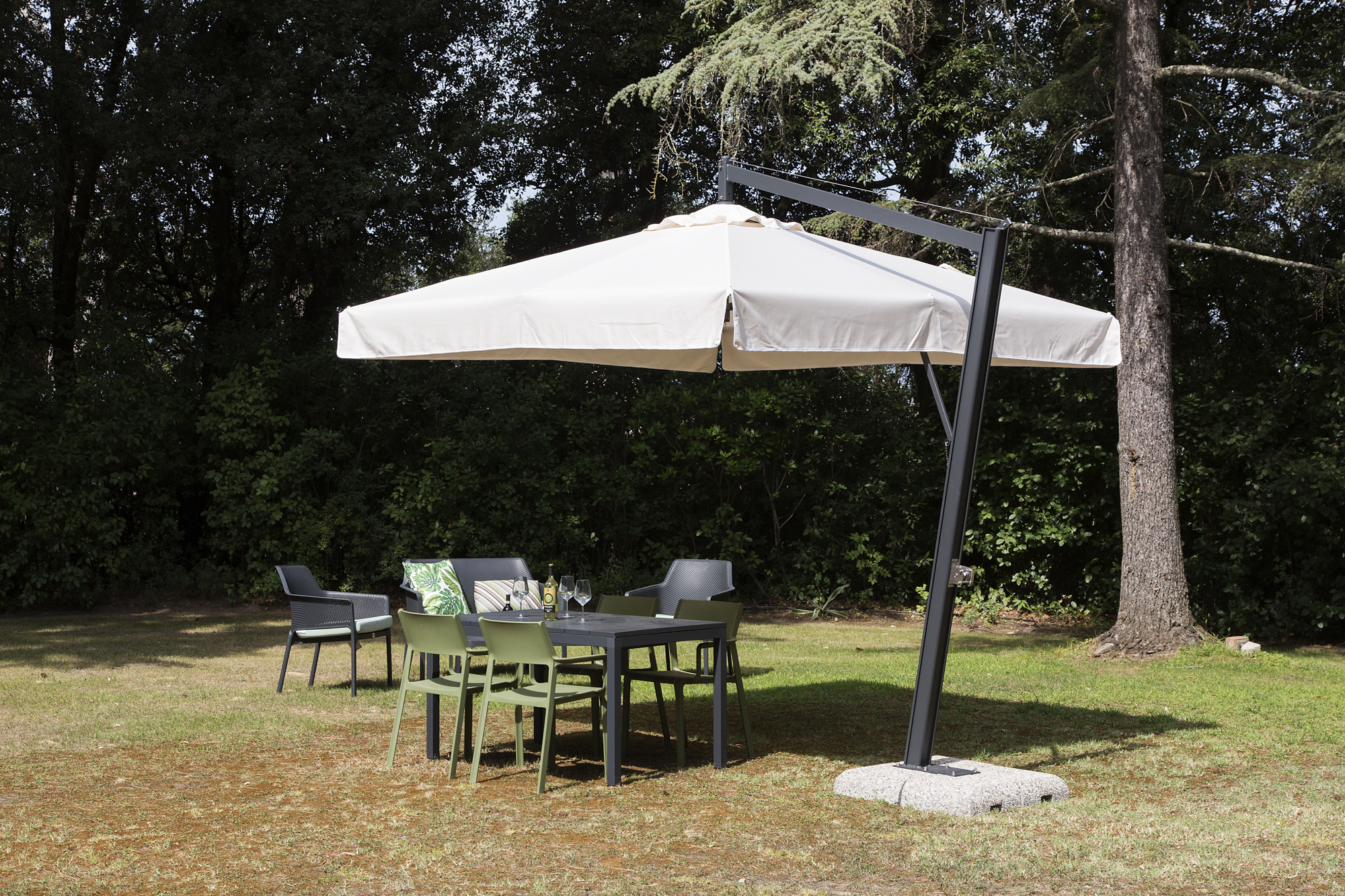Ombrellone a palo laterale con struttura in alluminio verniciato antracite o in alluminio anodizzato (finitura a scelta tra nero, argento o bronzo).