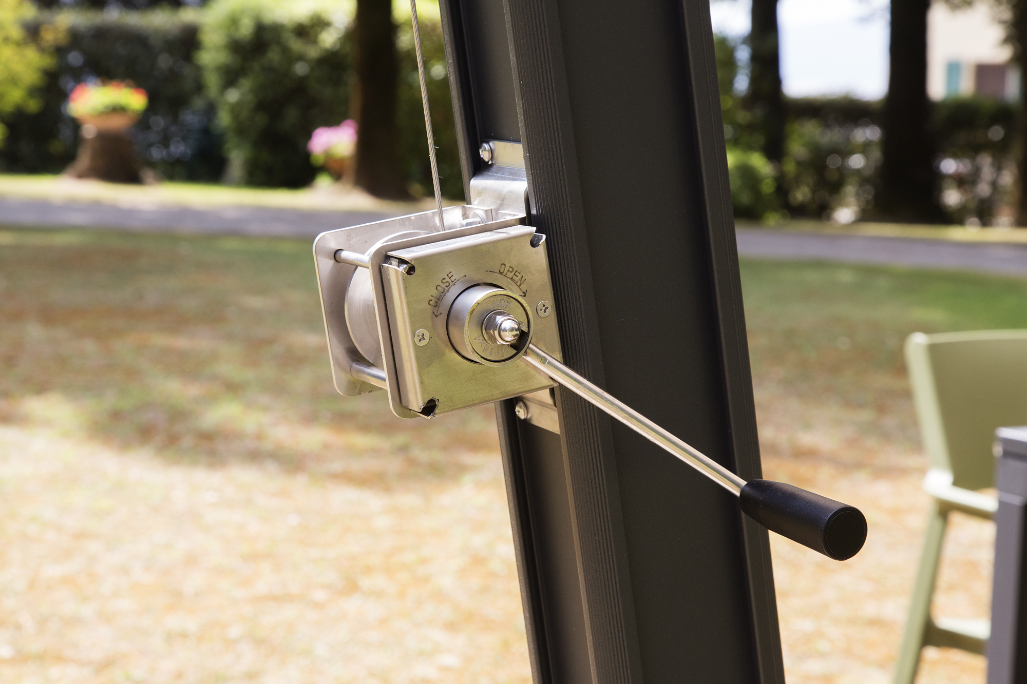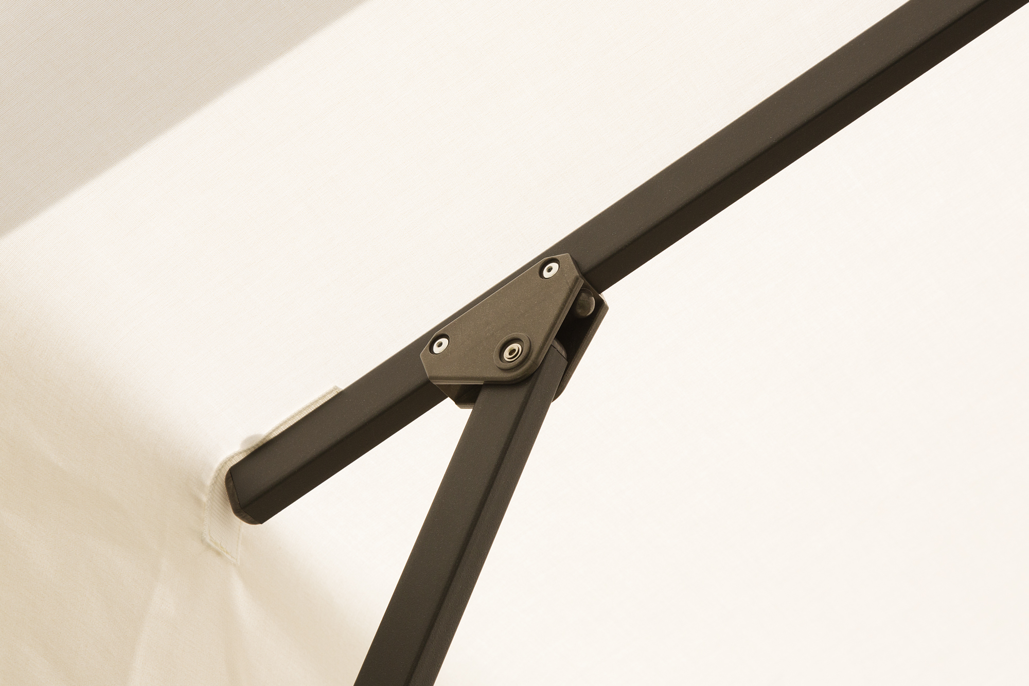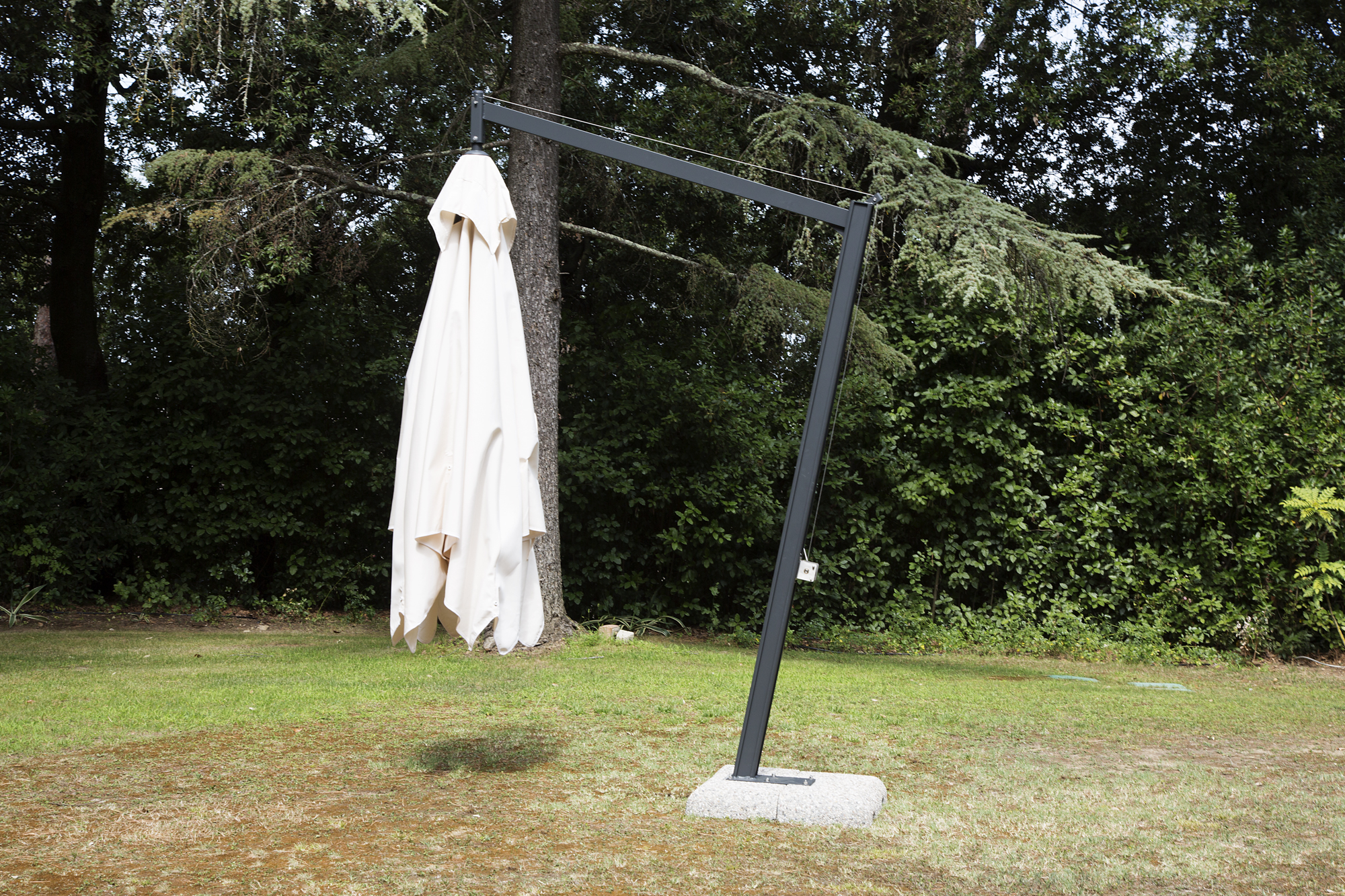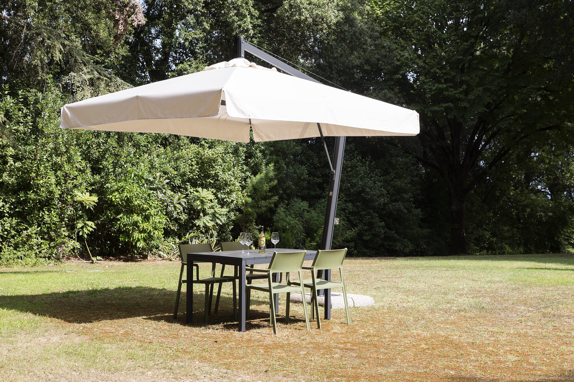 Ombrellone a palo laterale con struttura in alluminio verniciato antracite o in alluminio anodizzato (finitura a scelta tra nero, argento o bronzo).
