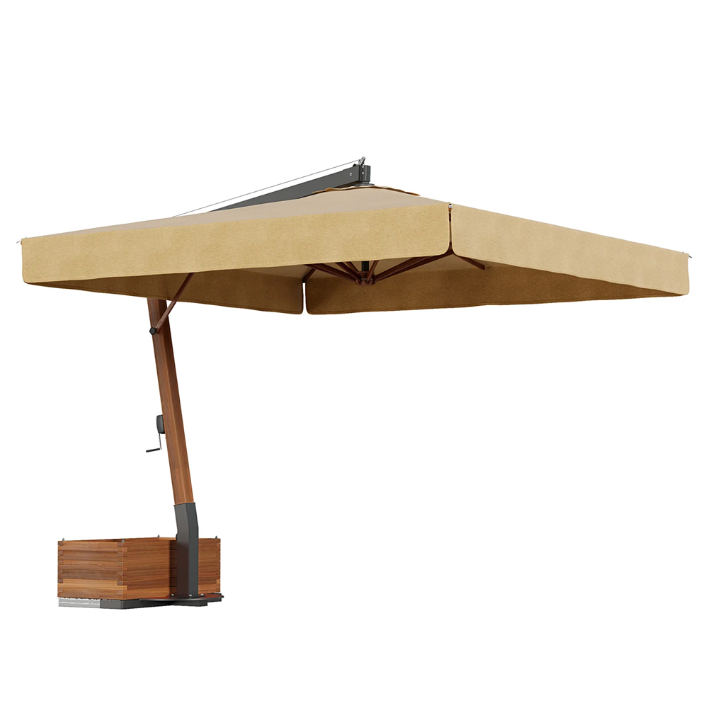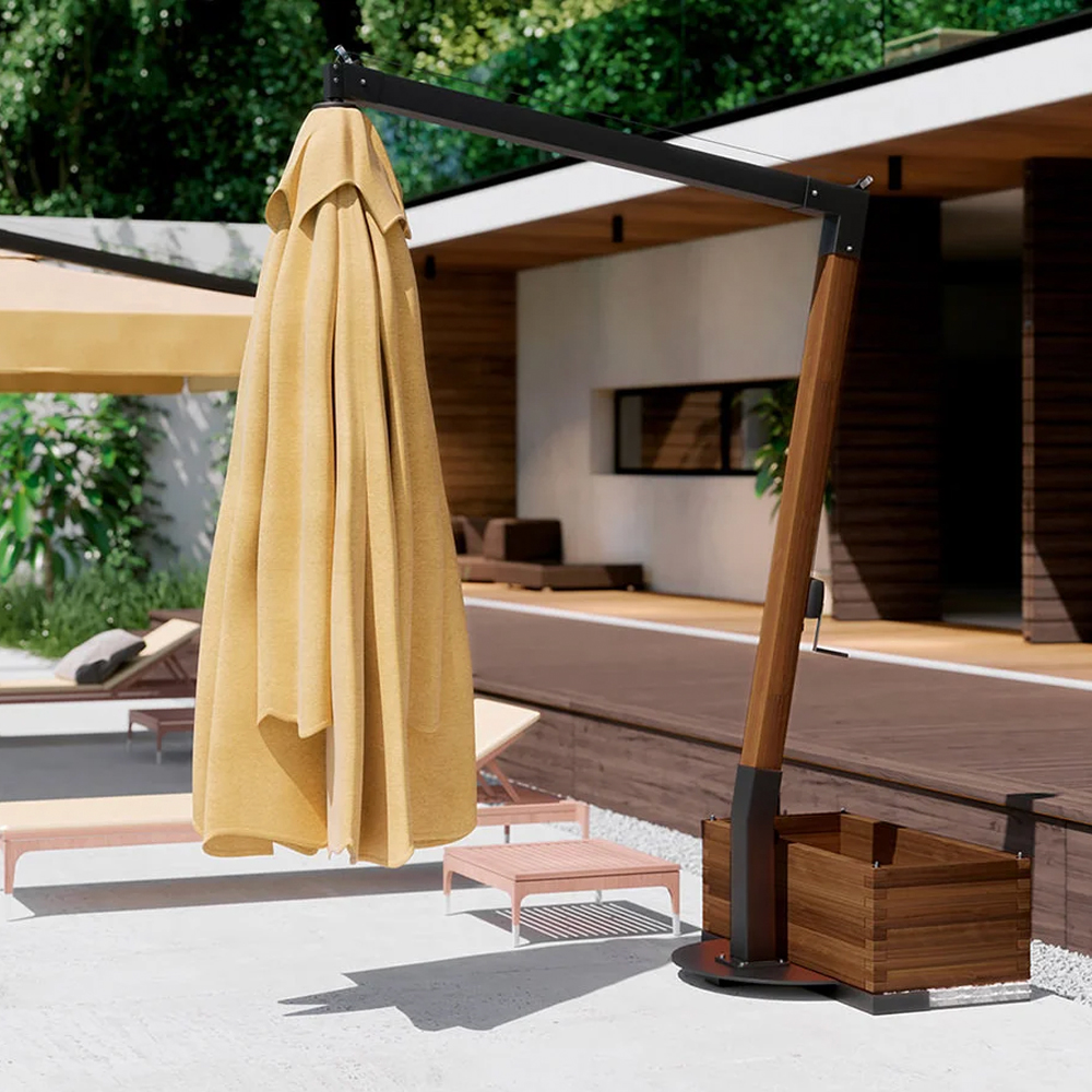 Palo verticale in pregiato legno iroko impregnato – palo orizzontale in alluminio verniciato grigio antracite – stecche in pregiato legno duro verniciato tinta iroko – componenti in acciaio zincato e verniciato – completo soffietto antivento – apertura a manovella – con stecca di rinforzo tra palo verticale e ragno – girevole a 360° – base in acciaio compresa, piastre 50 x 50 escluse.